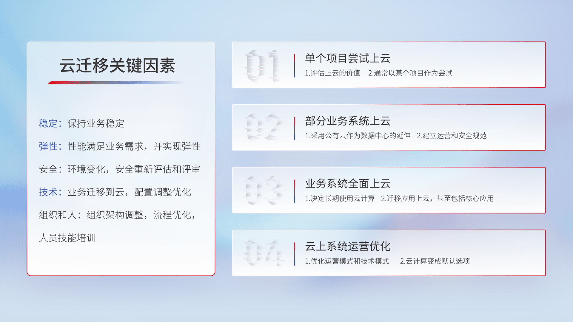 结合实际业务,,,,从规划设计、、云平台选型、、、、云原生改造、、、数据迁移、、集成交付,,迁移全过程为客户识别最佳上云路径,,做好风险识别管理,,,,设计网络架构、、、身份权限、、安全审计合规、、、操作审计、、、、日志审计、、监控告警策略、、多站点容灾设计等,,对云上基础设施进行整体规划,,,提升IT治理水平,,,,以满足弹性、、、、高可用、、、、高性能的需求。。