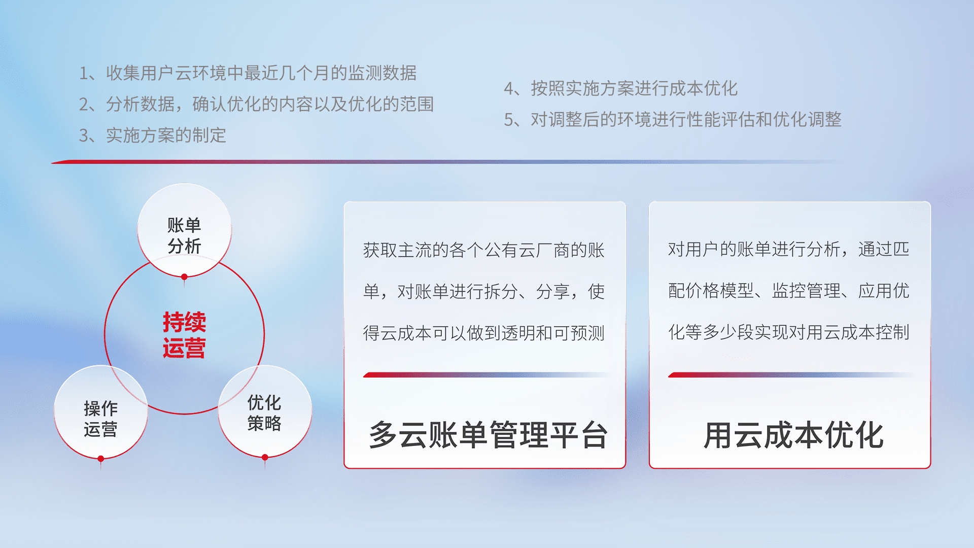 通过多云纳管,,,,以统一的资源数据模型把客户的云资源进行抽象和封装,,,,进而实现对多云资源的统一操作,,保障云资源管理的可靠性、、、稳定性与可用性。。。。量身定制化运维内容,,,配置、、开发运维、、、补丁管理、、、备份、、、监控、、、认证和访问管理、、审计和日常巡检等,,保障在用云过程中的可靠度,,,稳定度以及高可用率。。。。